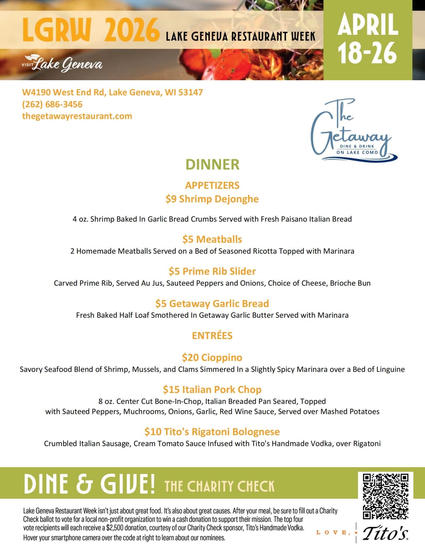 Just minutes from downtown Lake Geneva, The Getaway sits lakeside on beautiful Lake Como. Savor fine dining, unwind in a warm and welcoming setting, and take in the views that make every meal memorable.